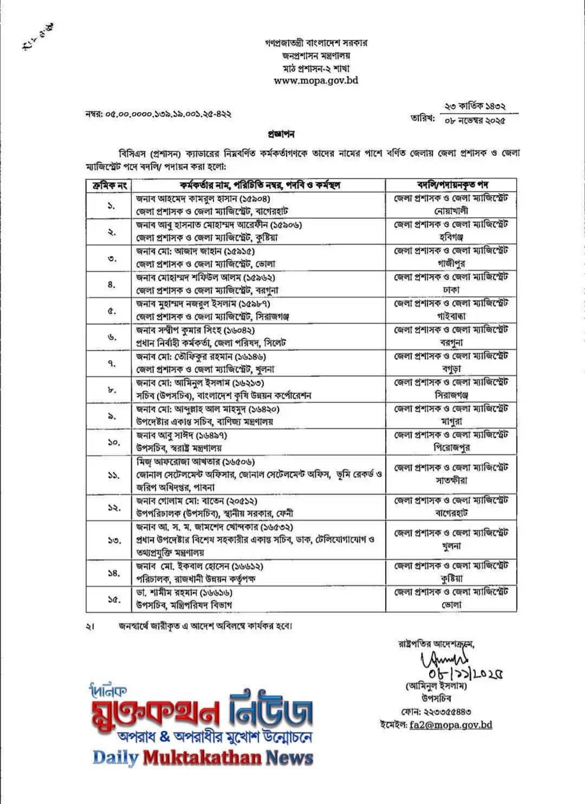1️⃣4️⃣ Imran Hossain — Deputy Secretary, Ministry of Fisheries and Livestock → Deputy Commissioner, Chuadanga